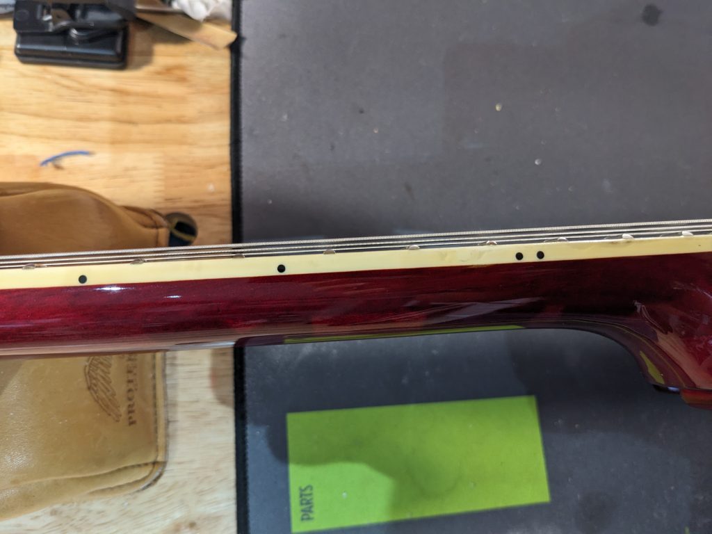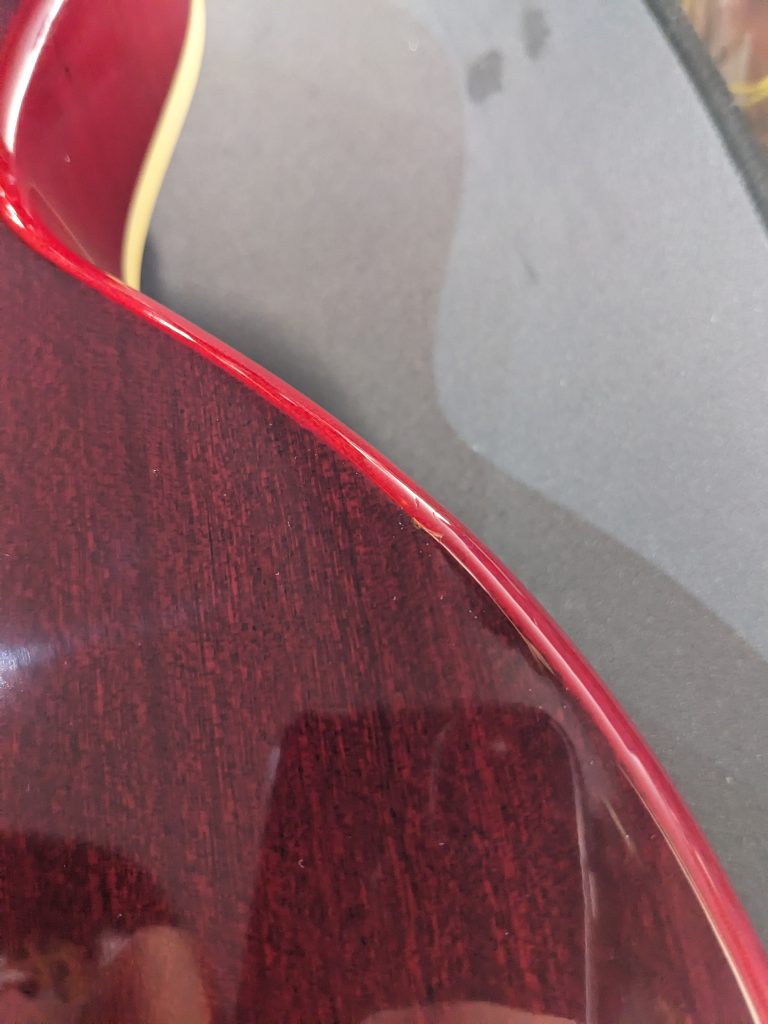 The guitar is in really good condition overall with loads of life left in the frets. The only thing to note is that over the years the guitar had picked up some knocks/dents. These have been sympathetically filled and polished. The areas of repair are on the bottom by the jack socket, on the back of the body and by the 11th fret (near the 12th dot markers). They are now smooth to the touch and only slightly visible.