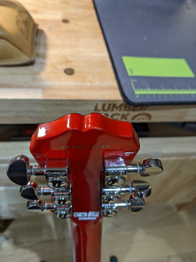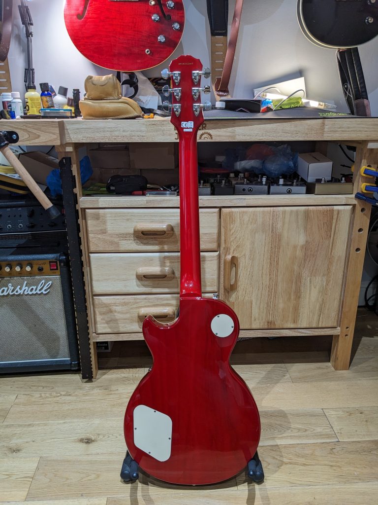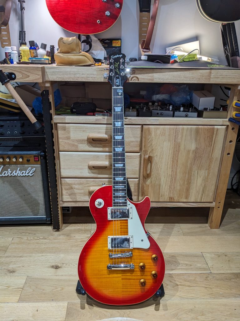 It has just had a full setup, making various small adjustments to lower the action and make the guitar sing, this included a fretboard condition, cleaned frets, pots being cleaned, and re-strung with a new set of D’Addario nickel wound XL strings (9-42) gauge.