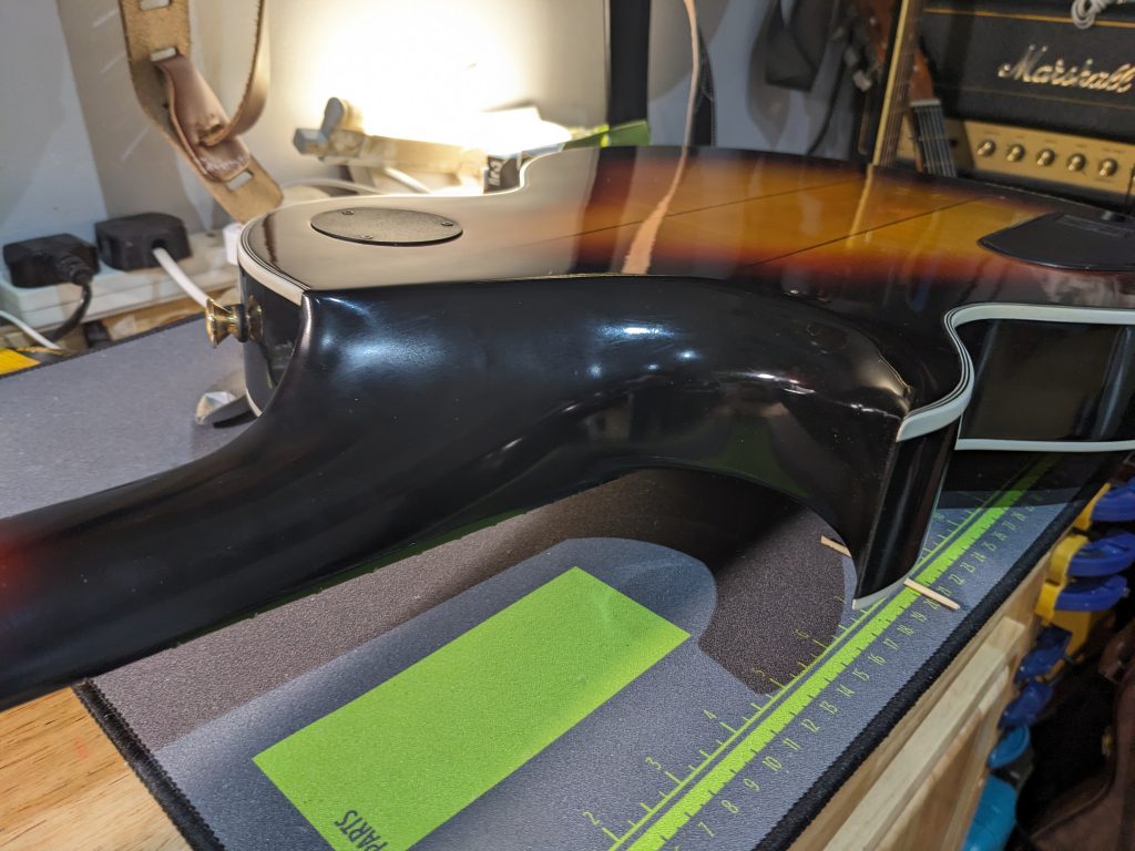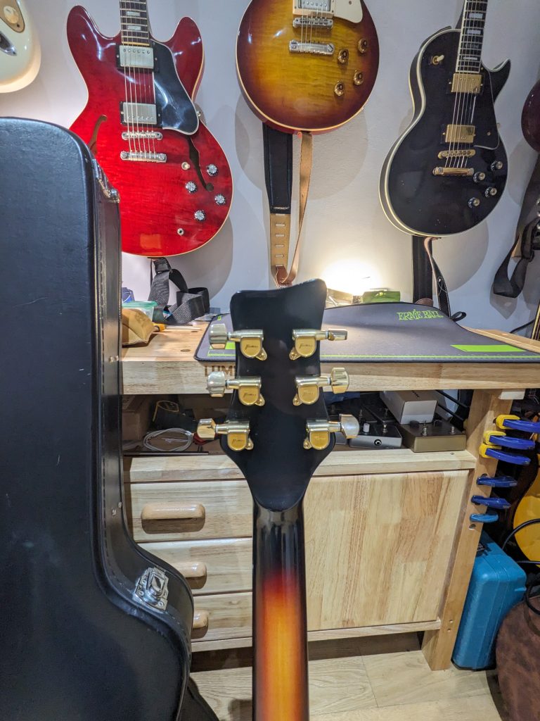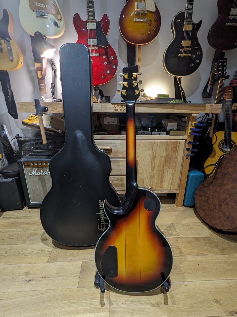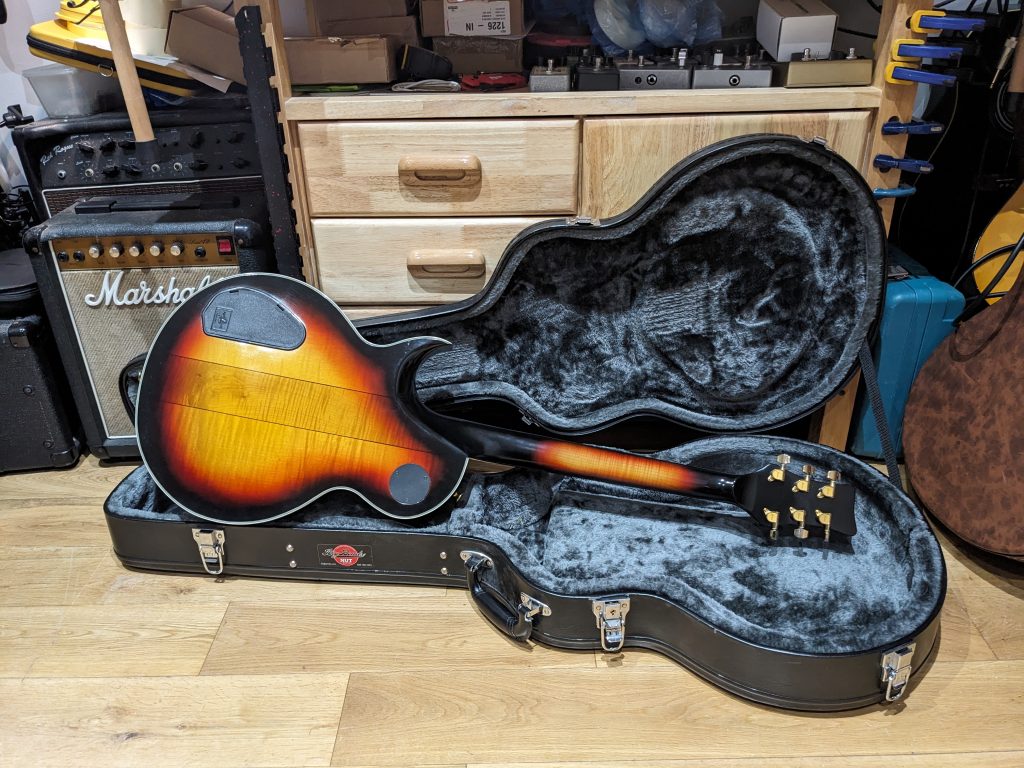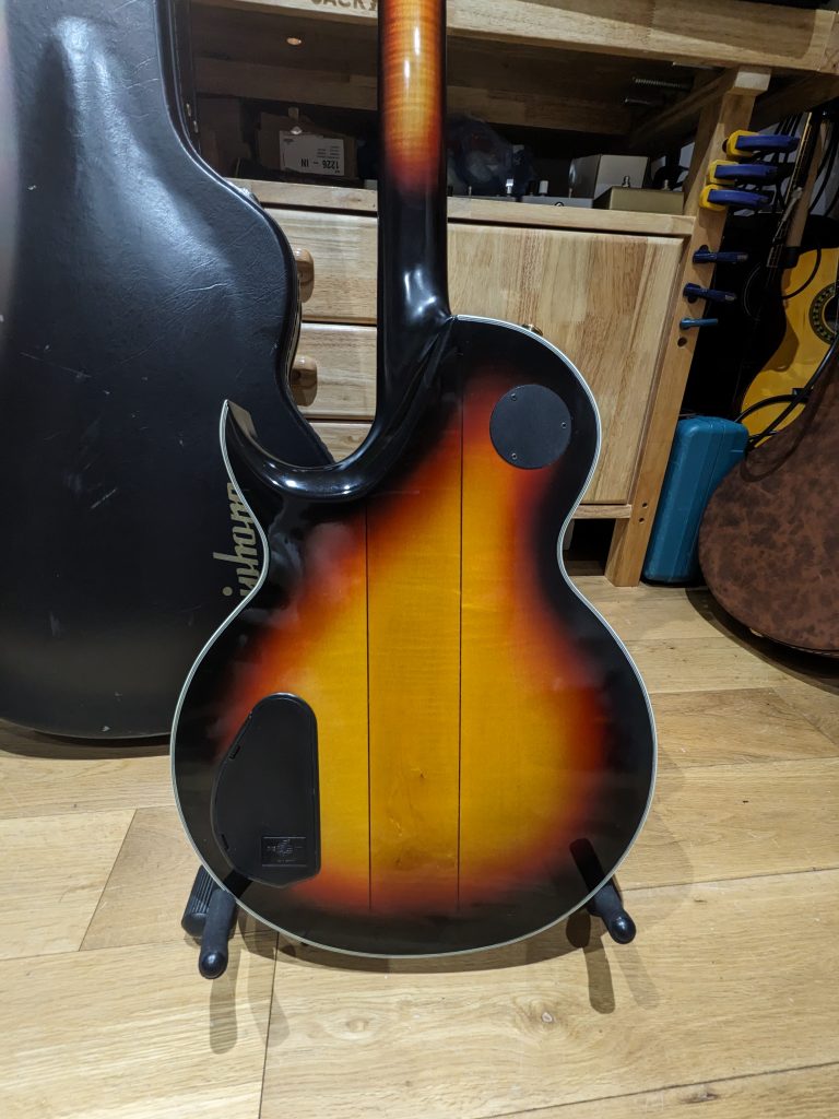 Originally finished in Cherry Sunburst, the factory lacquer unfortunately failed over time. Around 2021, the guitar underwent a refinish/refurbishment by the late Fern of Fern Evergreen Guitars, now presented in a stunning Vintage Sunburst Nitrocellulose finish. As the refinish was carried out in a small custom guitar workshop, it is not 100% perfect; however, some of the minor flaws add genuinely to its character, and the instrument has been priced accordingly. These small imperfections are clearly shown in the photos and video under direct lighting. During the restoration, the original nut was also upgraded to a hand-cut bone nut.
